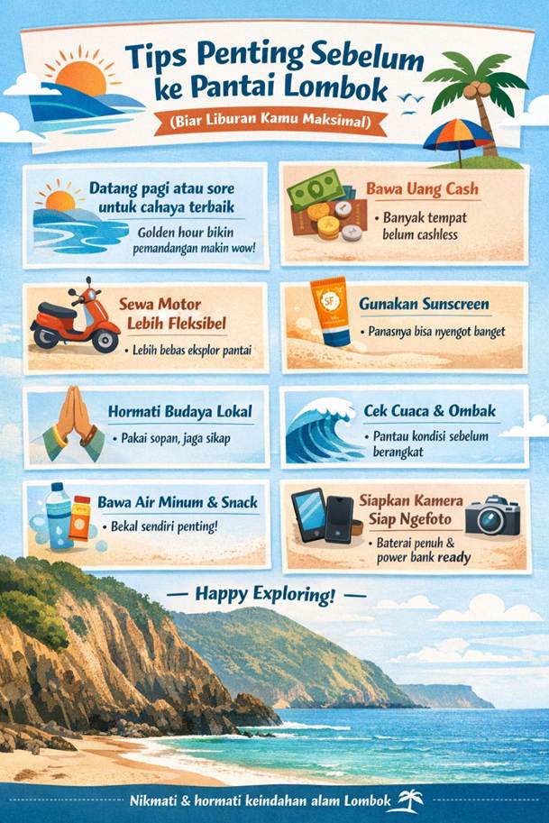 Sebelum kamu mulai eksplor pantai-pantai indah di Lombok, ada beberapa hal penting yang sebaiknya kamu perhatikan. Dari pengalaman lensa jalan, hal-hal kecil ini justru yang menentukan apakah perjalananmu akan terasa biasa saja… atau benar-benar berkesan.