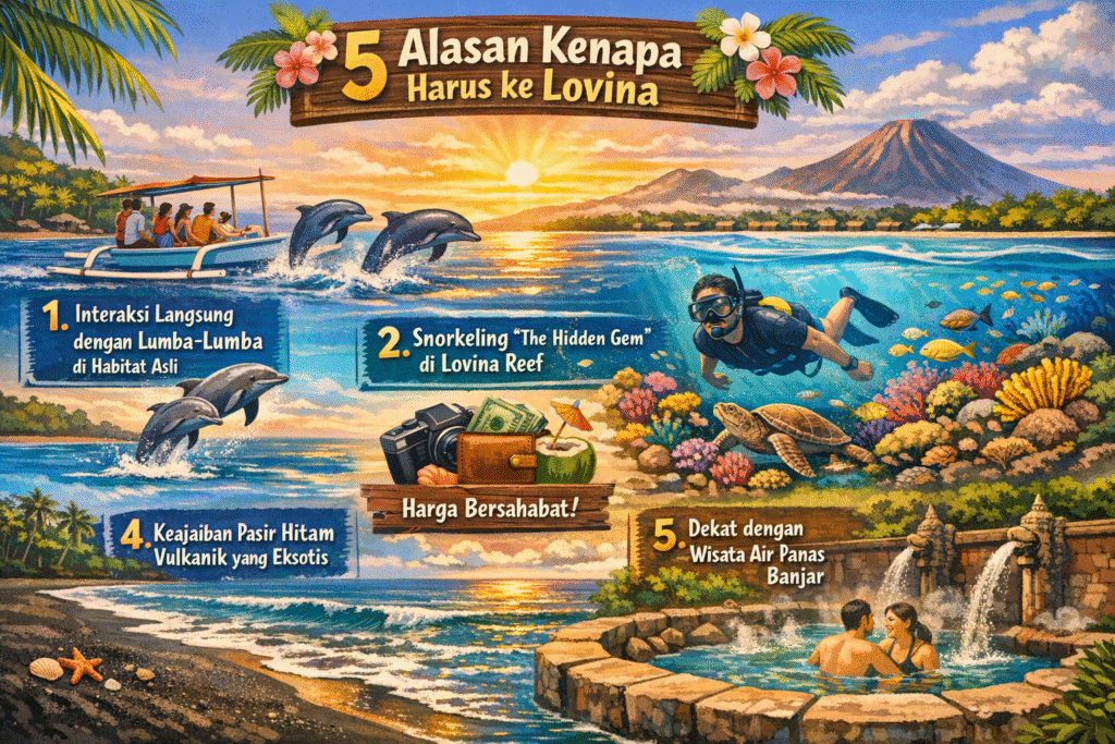 Lensa Jalan awalnya kalau ke Bali selalu menginjak kaki ke Kuta dan Seminyak. Tapi sejak memaksakan diri ke Lovina yang terletak di Bali Utara, pandangan Lensa Jalan langsung berubah. Lovina bukan sekadar tempat melihat lumba-lumba. Ini adalah bentuk kebebasan dari kemacetan Canggu dan kebisingan Seminyak.