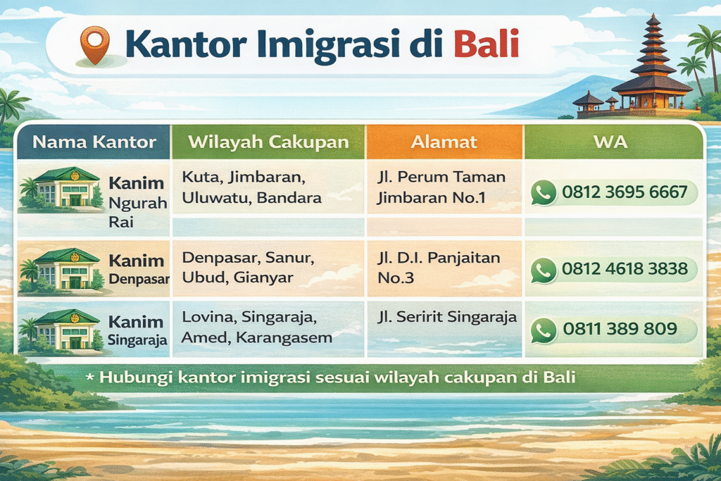 Bagi wisatawan asing, memiliki daftar kontak darurat di Bali yang tervalidasi bukan sekadar tindakan preventif, melainkan prasyarat untuk navigasi yang aman. Saat ini Lensa Jalan akan memberikan daftar nomor kontak dan alamat instansi keimigrasian berdasarkan wilayah kerja masing-masing.