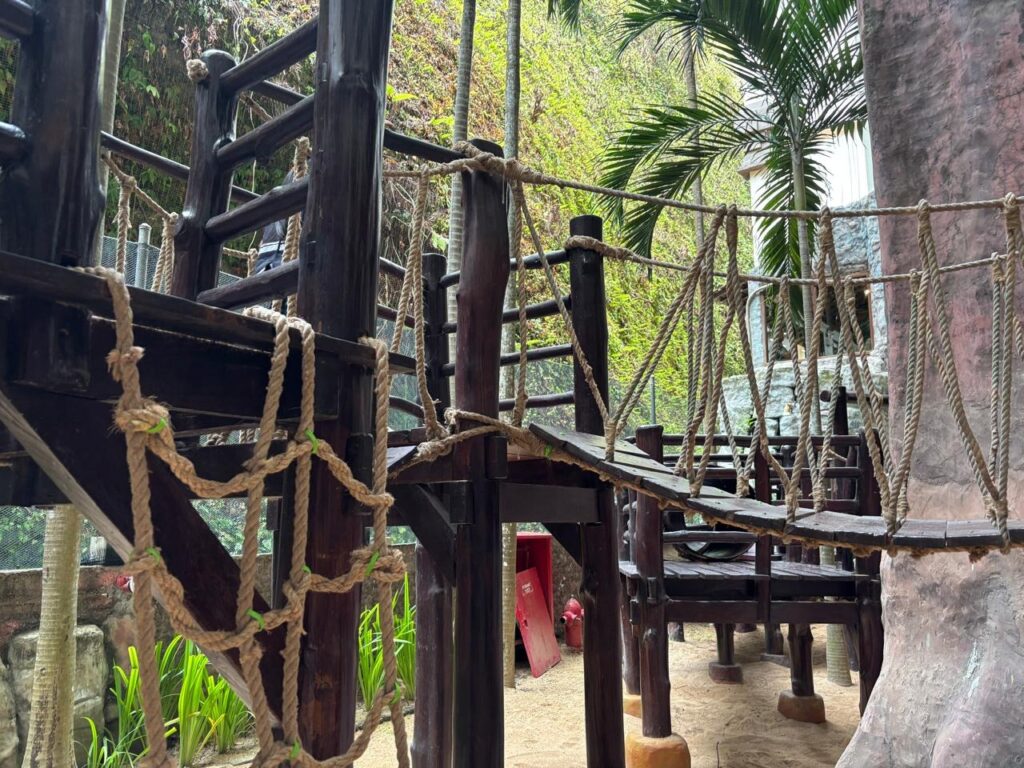 Area Outdoor ternyata gak panas loh. Disini “lantai”nya menggunakan pasir. Permainannya lebih melatih otot anak. Memanjat, wall climbing, dan slide. Pasirnya bersih, dan kalau mau kembali masuk ada area cuci kaki.