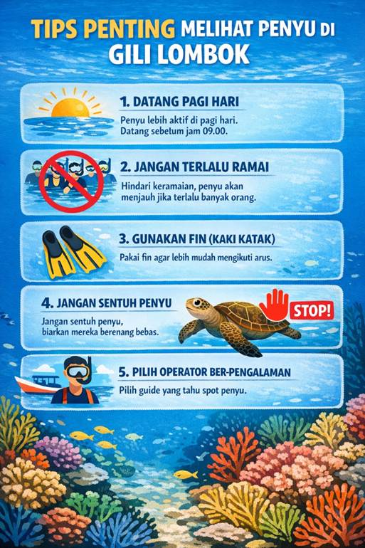 Banyak artikel tidak membahas hal ini secara detail, padahal justru ini yang menjadi kunci utama jika kamu benar-benar ingin melihat penyu saat snorkeling di Gili Lombok. Berikut beberapa tips penting yang sudah terbukti dari pengalaman langsung di lapangan: