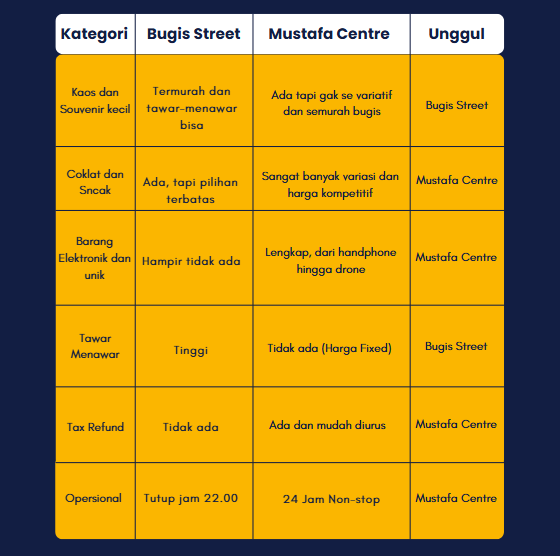 Kalau fokusmu adalah oleh-oleh ikonik di bawah SGD 5, Bugis Street lebih cepat dan murah. Jika kamu mencari cokelat, parfum, atau barang niche lain dan ingin memanfaatkan tax refund, Mustafa Centre lebih unggul kalau dilihat dari total keseluruhan.