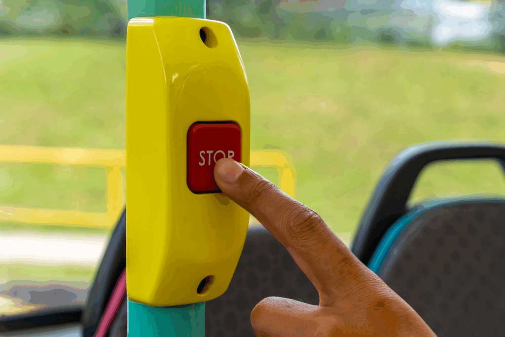 - Saat mendekati halte tujuan, tekan tombol “stop” yang ada di tiang atau pegangan bus, biasanya berwarna merah, agar sopir tahu kamu mau turun.