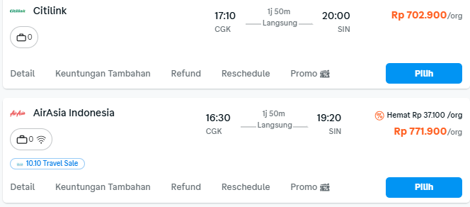 Untuk menghemat budget, kamu bisa beli tiket pesawat low fare yang disediakan beberapa maskapai tertentu, seperti Air Asia, Scoot, Lion, dan lainnya. Tapi perlu kamu perhatikan, umumnya pesawa-pesawat ini tidak memberikan fasilitas bagasi. Ada 2 cara agar kamu tidak “rugi” saat beli tiker: