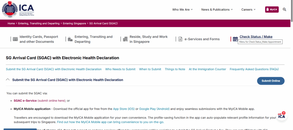 - SGAC. Nah ini yang paling penting. Sebelum masuk Singapura, minimal 3 hari sebelumnya kamu wajib mengisi SGAC di https://www.ica.gov.sg/enter-transit-depart/entering-singapore/sg-arrival-card kamu bisa mengisinya secara online dan simpan buktinya. SGAC akan masuk dalam sistem imigrasi Singapura, tapi siapkan saja screenshootnya untuk berjaga-jaga.